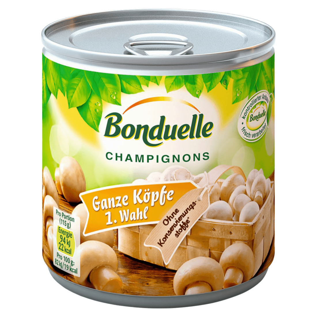 Champignons, Wasser, Salz, Säuerungsmittel: Citronensäure, Antioxidationsmittel: Ascorbinsäure.