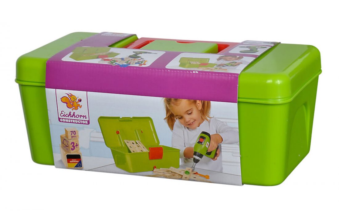 Eichhorn Constructor, Werkzeugbox: Die Werkzeugbox für alle Constructor-Baumeister! In dem Werkzeugkoffer befindet sich nicht nur ein Kompakt-Schrauber mit inklusiven Bits zum Wechseln, sondern auch zahlreiche Constructorbauteile. Das Zusammenfügen fördert und schult das räumliche Denken und die Feinmotorik. Für die Herstellung der Eichhorn Constructor Modelle wird ausschließlich FSC® 100% Holz aus nachhaltiger Forstwirtschaft verwendet. Dieser Eichhorn Artikel ist Made in Germany. Nach dem Spielspaß kann alles wieder in der Box wiederverstaut werden. Für Kinder ab drei Jahren geeignet.