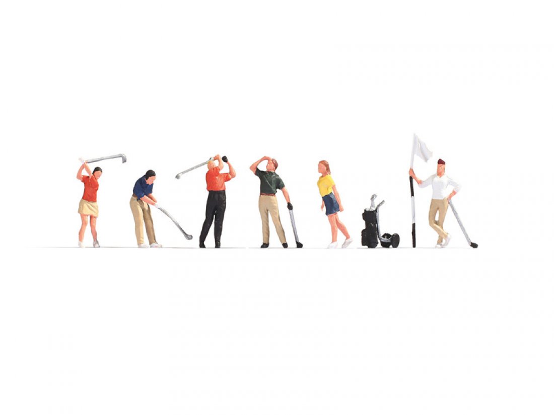 Das Modellfiguren-Set »Golfspieler« enthält sechs handbemalte Figuren, die einer sehr beliebten Ballsportart nachgehen. Damit kann man diese Szene auch auf der Modellbahnanlage nachbauen. Passend dazu gibt es die Golf-Driving-Range.