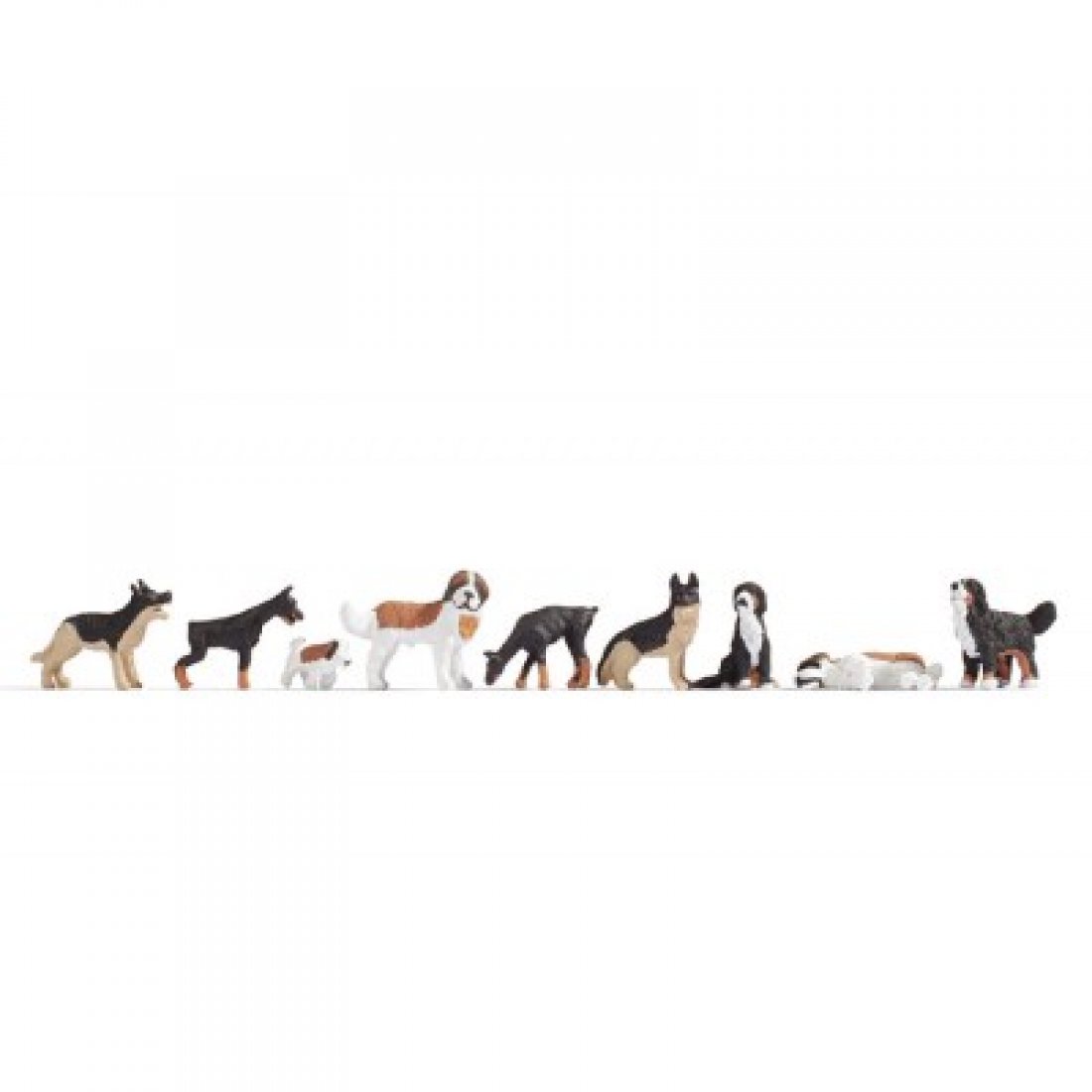 Im Set sind verschiedene Hunderassen im Modell der Spurweite H0 im Modellbahnmaßstab dargestellt: Schäferhund, Bernhardiner, Berner Sennenhund, sowie ein Dobermann in verschiedenen Posen.