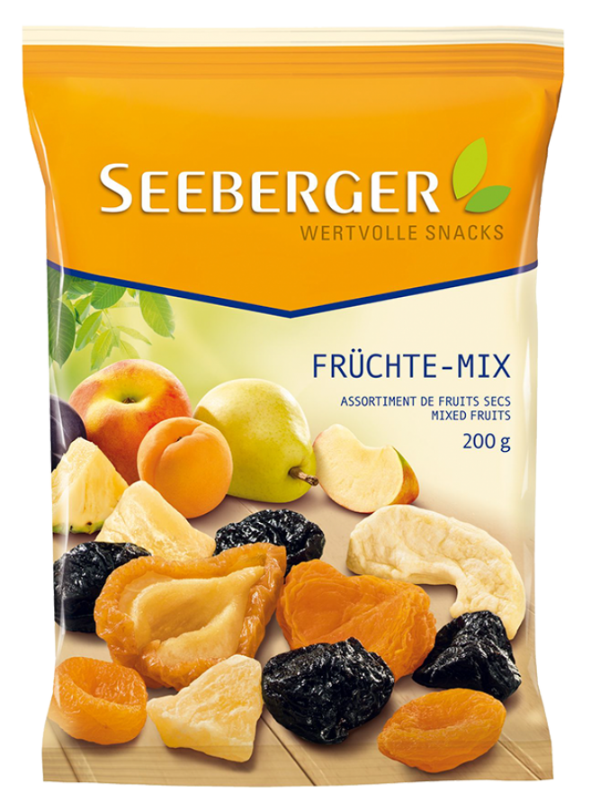 Der sonnig-süße Mix aus Apfelstücken, Aprikosen, Birnen, Pfirsichen, Ananasstücken und Pflaumen sorgt garantiert für fruchtige Abwechslung und machen jeden zu einem echten Seeberger Frucht-Fan.