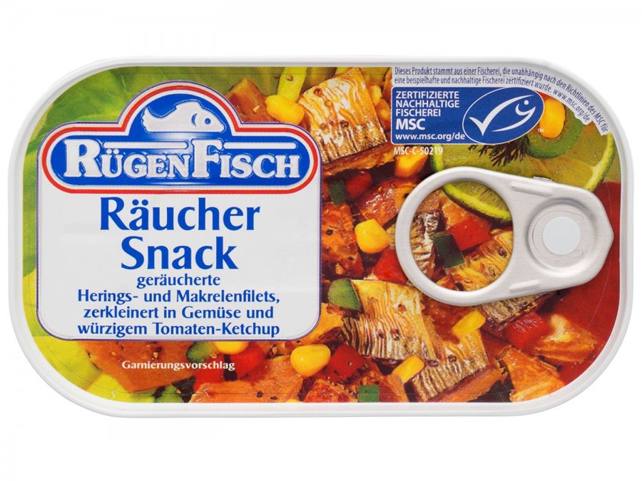 Geräucherte Herings- und Makrelenfilets, zerkleinert, in Gemüse und würzigem Tomaten-Ketchup.