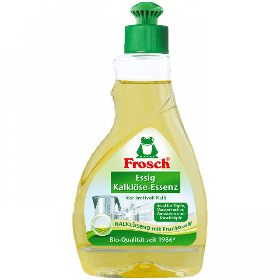 Die Frosch Essig Kalklöse-Essenz ist ein stark konzentrierter Spezialreiniger zur Entfernung von Kalk und Kalkablagerungen. Dank ihrer Rezeptur mit natürlichem Fruchtessig, ist die Essig Kalklöse-Essenz unter anderem ideal zur Reinigung von Töpfen, Wasserkochern, Armaturen und Duschköpfen geeignet und sorgt somit für strahlende Sauberkeit.