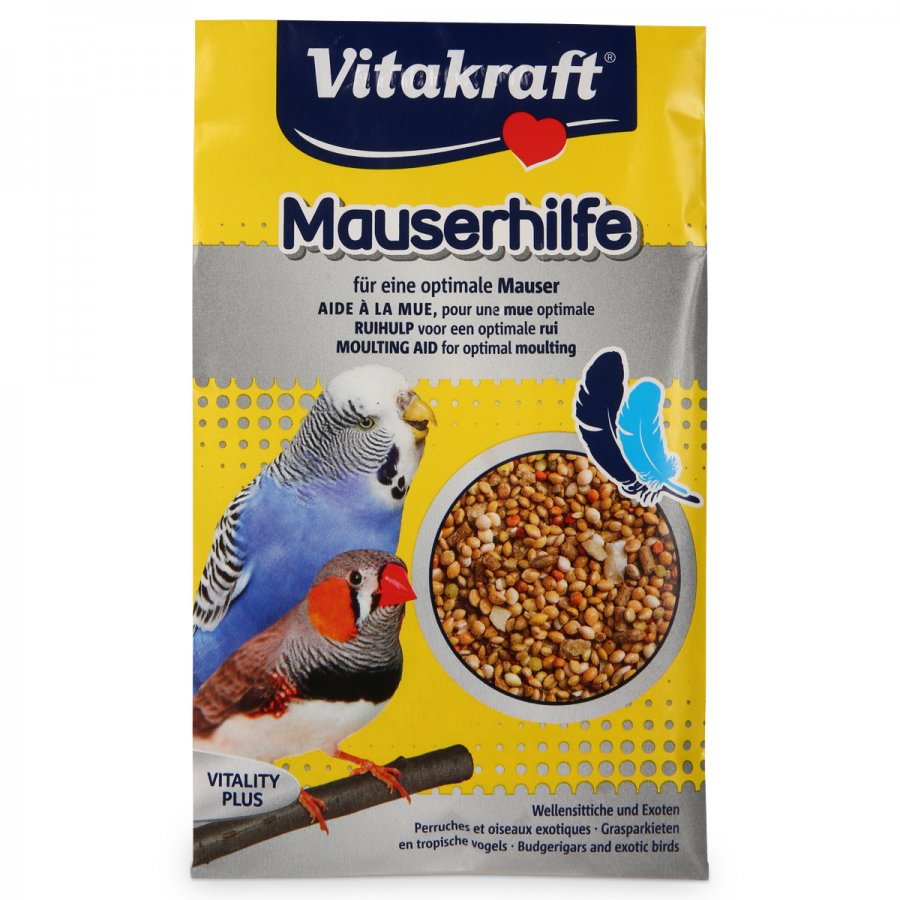 Während des Federwechsels benötigen Vögel besonders viel Pflege. Die Mauserhilfe von Vitakraft ist genau das Richtige. Sittiche und Exoten versorgt die Mauserhilfe mit notwendigen Vitaminen, Mineralstoffen und Aufbaustoffen, sodass ein schneller und reibungsloser Ablauf der Mauser stattfinden kann.